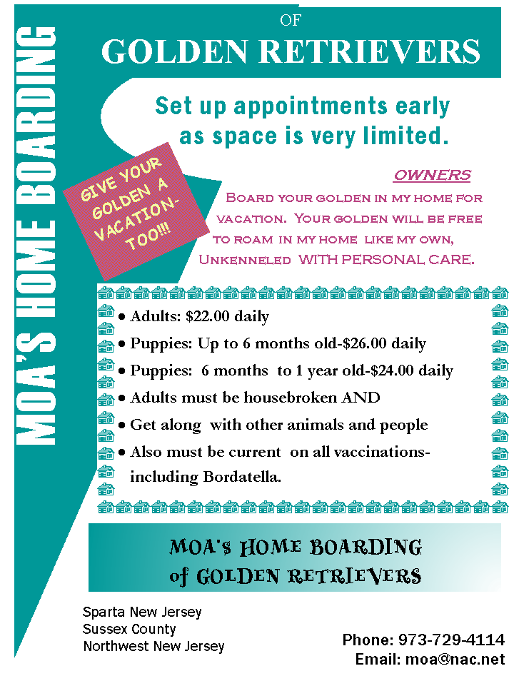 | * Adults: $24.00 daily 1 yr + MALES MUST BE NEUTERED * Puppies: 7 months to 1 year old - $26.00 daily * Puppies: Up to 6 months old - $28.00 daily *Adults should be housebroken and *Get along with other animals and people * I will need a copy of current vaccination record. *All medical conditions must be disclosed ahead of time to assure I can give the proper care to your pet. ( NO EXTRA CHARGE to administer medications). PLEASE NOTE: I cannot accept a dog with a CONTAGIOUS CONDITION at the time of boarding. |