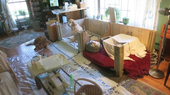 Picture 1: My living room has been transformed into a nursary and I have everything ready for Brazin's delivery, while she spends some time getting familiar with the whelping box. Rascal keeps her company.